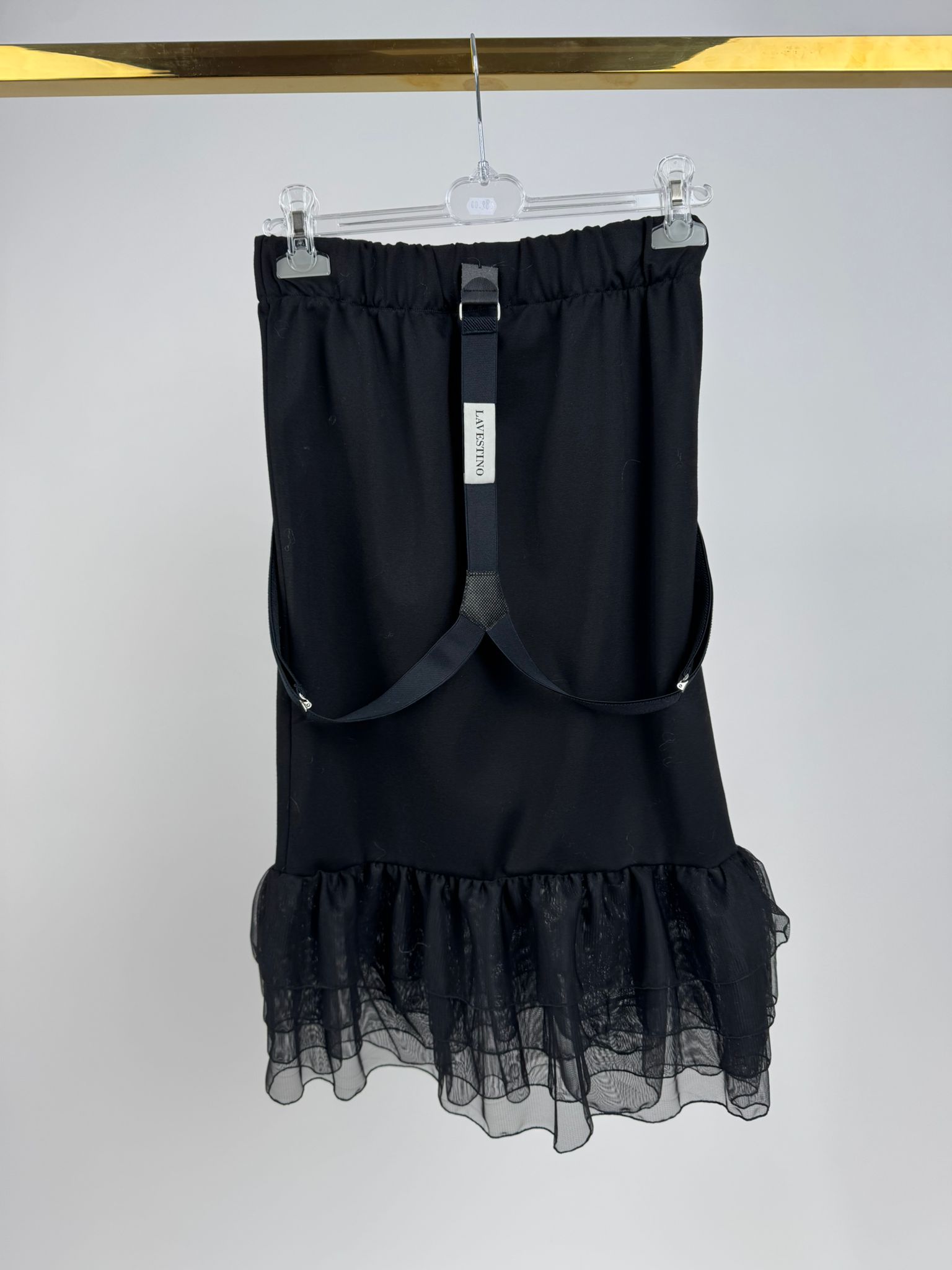 Zmysłowe Wykończenie: Dół spódnicy został zwieńczony subtelną, wielowarstwową falbanką z lekkiego tiulu, która nadaje całości lekkości i dziewczęcego uroku w nowoczesnym wydaniu.