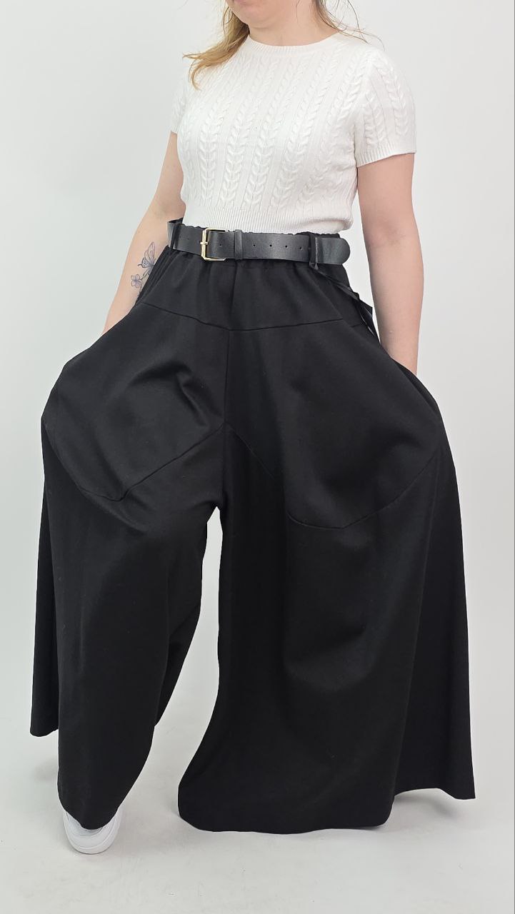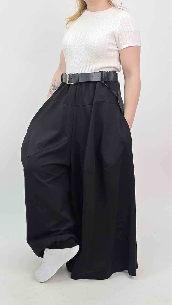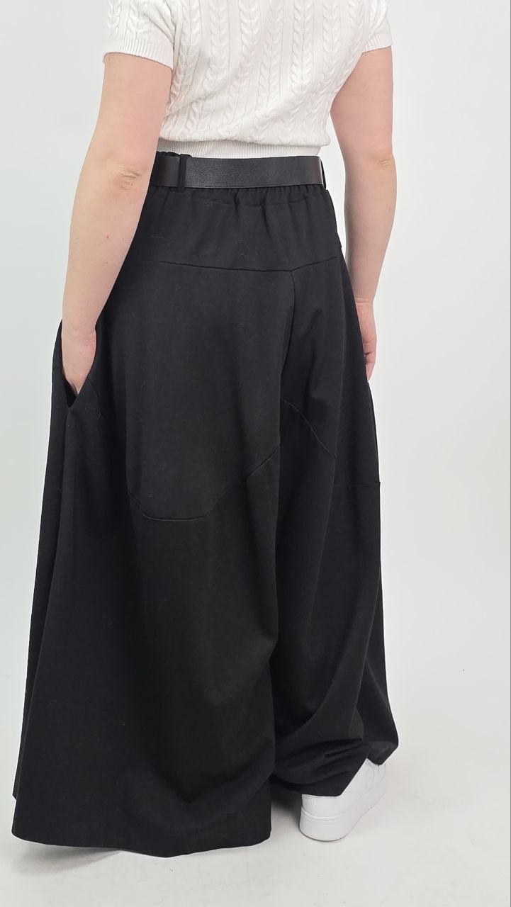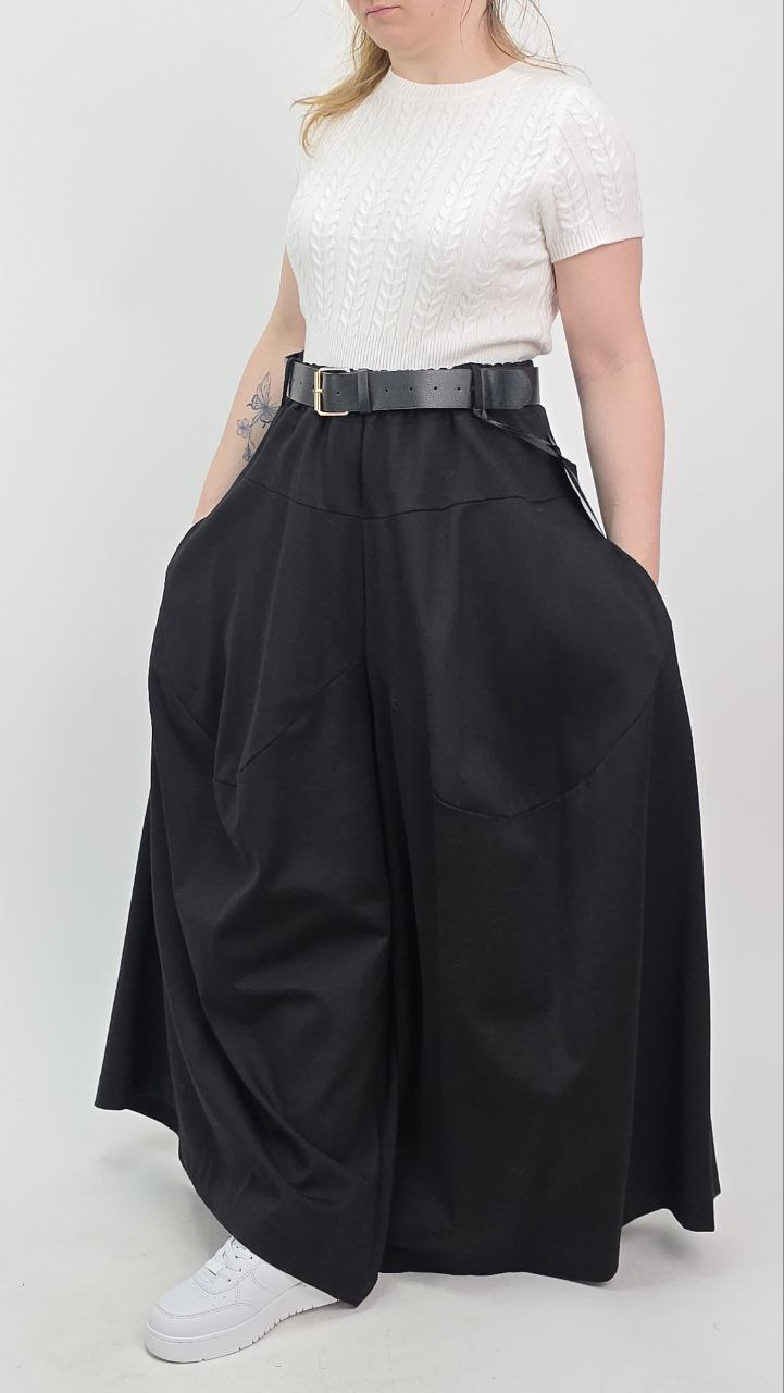 Wyjątkowy model łączący elegancję spódnicy z komfortem spodni. Pięknie skrojone, z dopasowaną górą i swobodnie opadającą, szeroką formą, tworzą efektowną, płynną sylwetkę. Cięższa, wysokiej jakości tkanina sprawia, że materiał doskonale się układa i nadaje całości luksusowego charakteru. W pasie wygodny ściągacz oraz pasek, który podkreśla talię.
