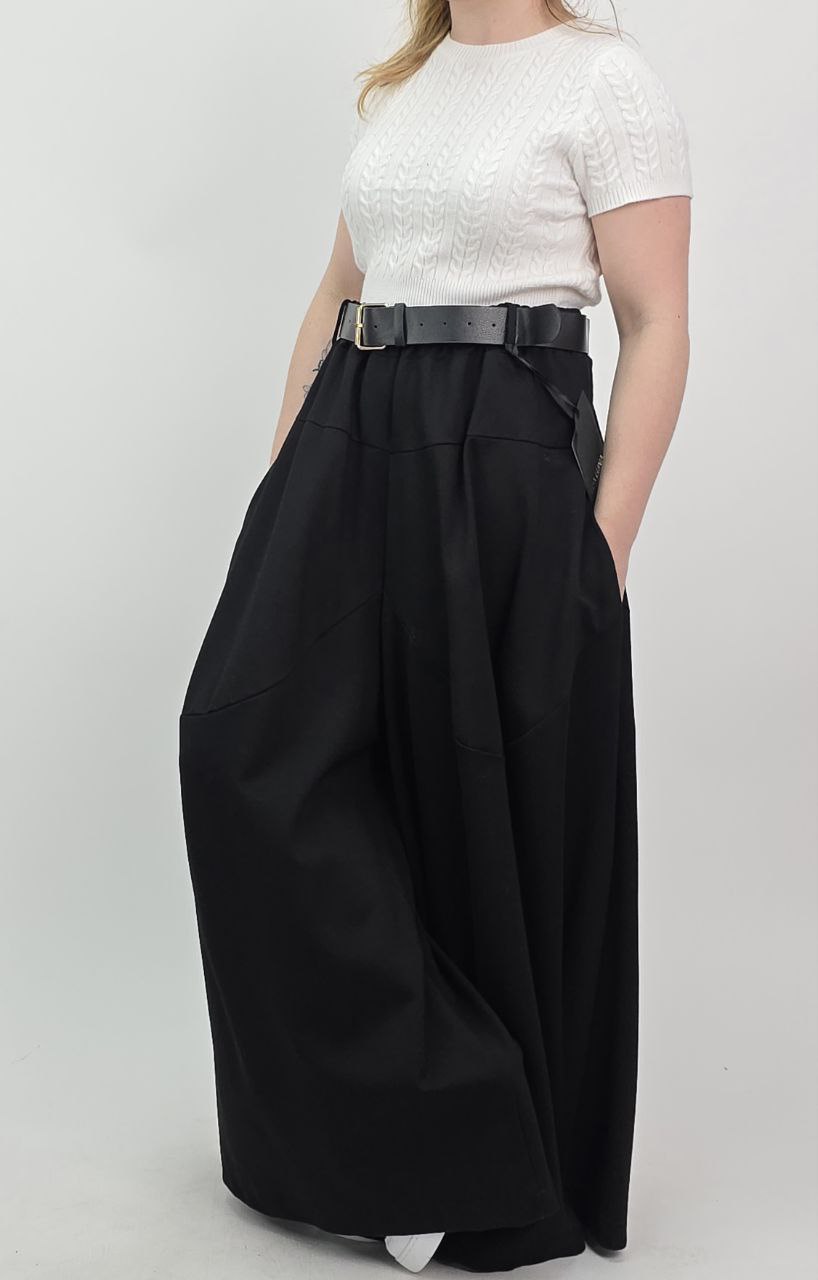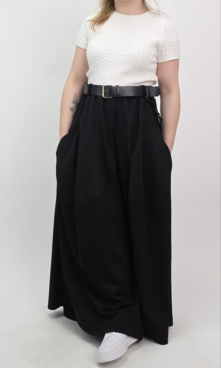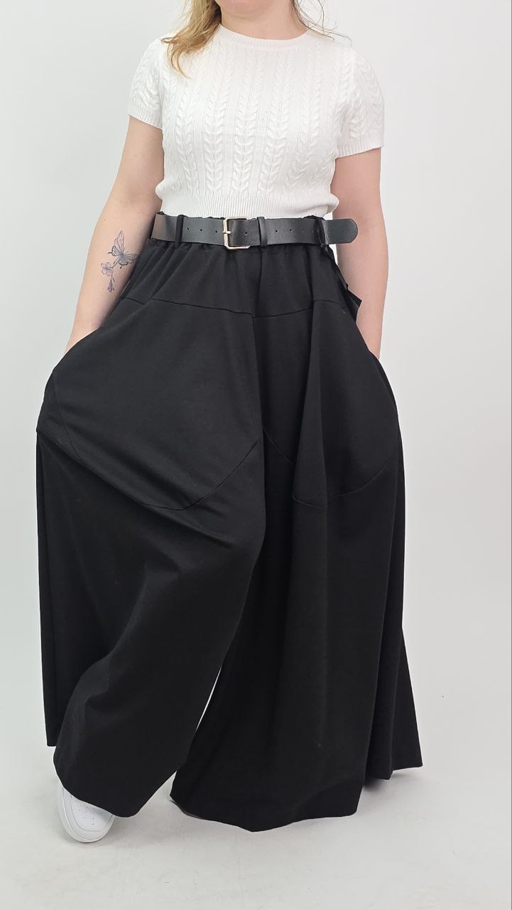 Wyjątkowy model łączący elegancję spódnicy z komfortem spodni. Pięknie skrojone, z dopasowaną górą i swobodnie opadającą, szeroką formą, tworzą efektowną, płynną sylwetkę. Cięższa, wysokiej jakości tkanina sprawia, że materiał doskonale się układa i nadaje całości luksusowego charakteru. W pasie wygodny ściągacz oraz pasek, który podkreśla talię.