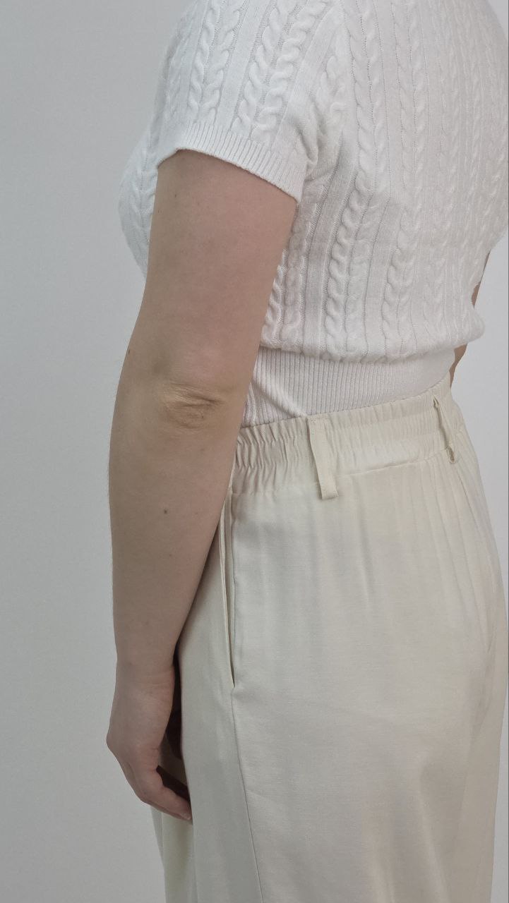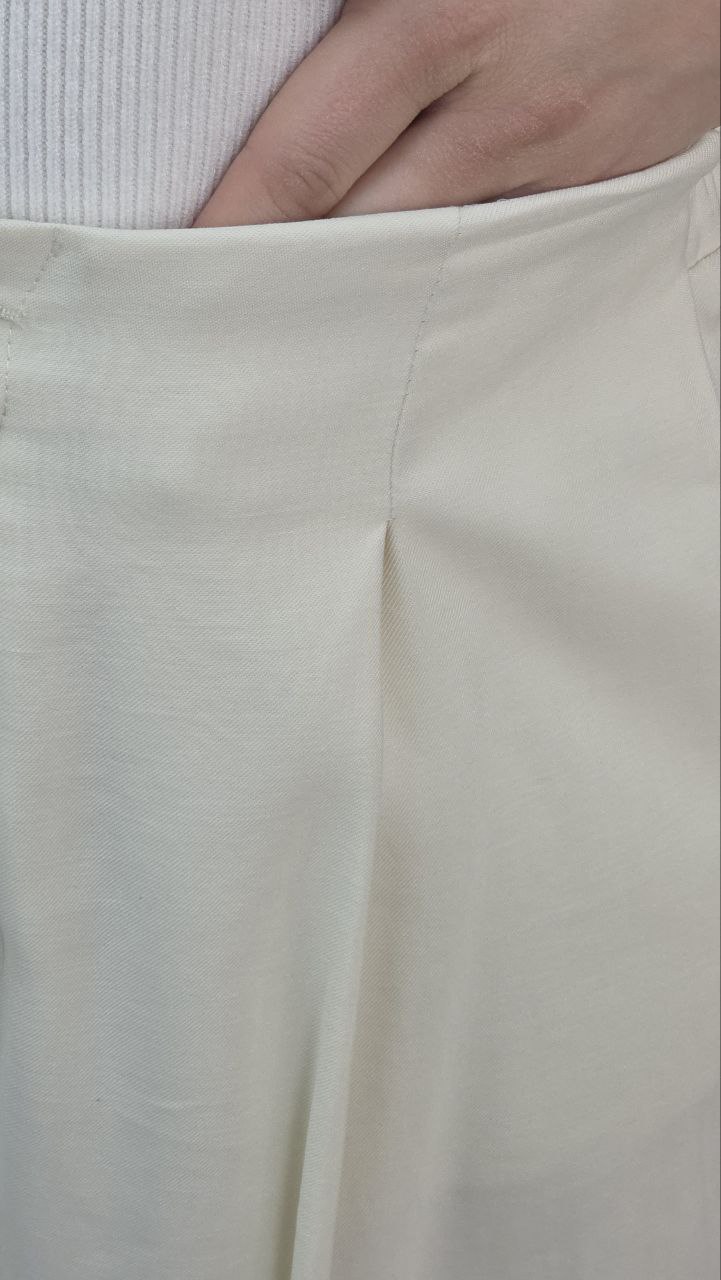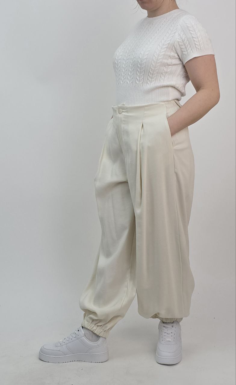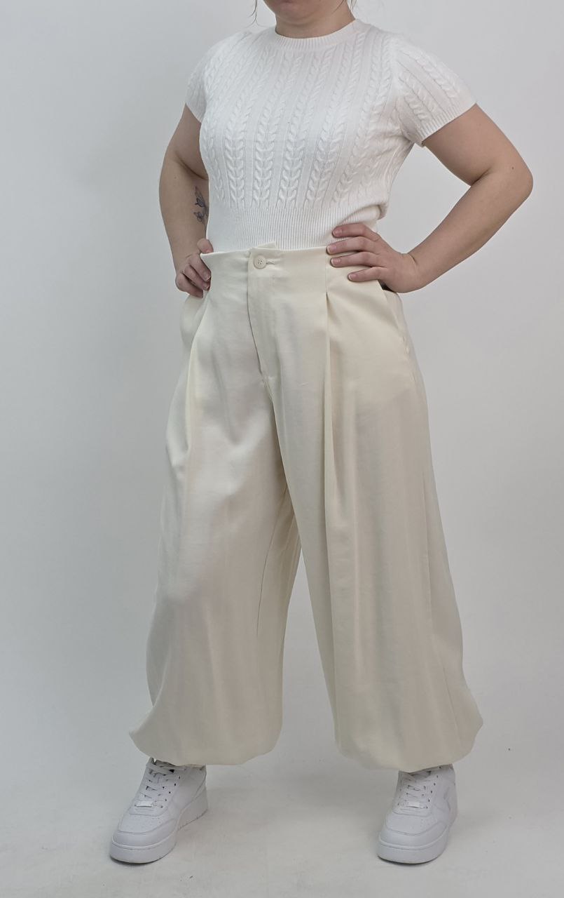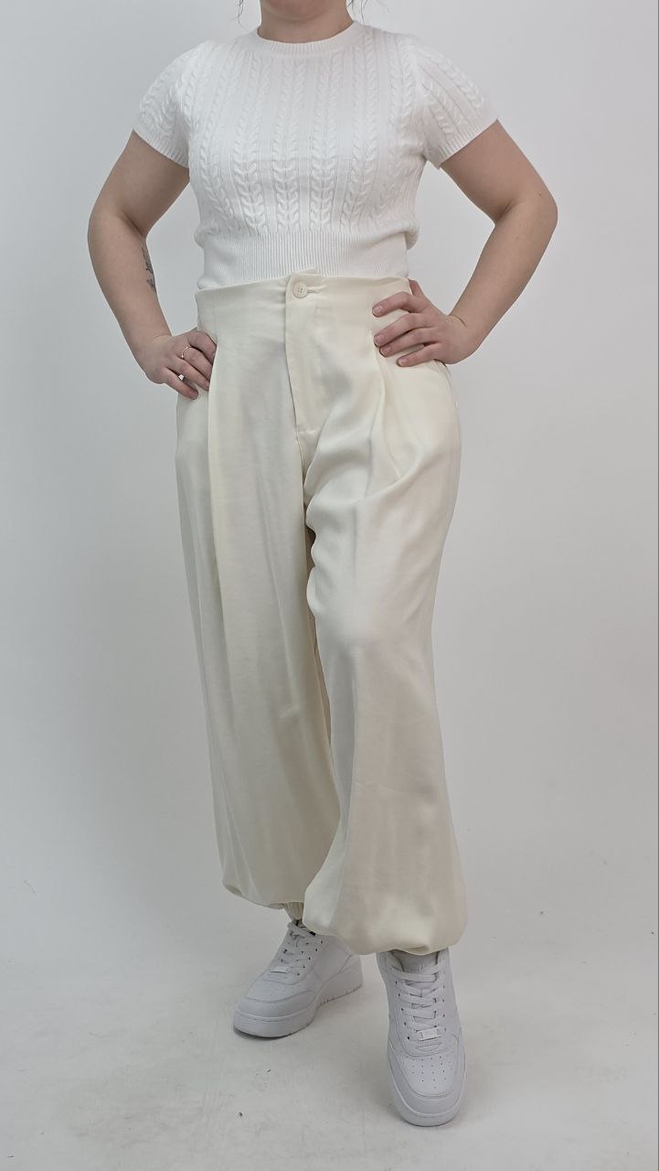 Eleganckie alladynki w modnym, kokosowym odcieniu. Szerokie nogawki i lekka, przyjemna w dotyku tkanina wiskozowa zapewniają swobodę oraz komfort noszenia. Model zapinany na zamek, z bocznymi kieszeniami i szlufkami, idealnie sprawdzi się w stylizacjach wiosenno-letnich.