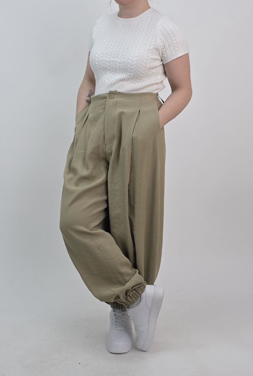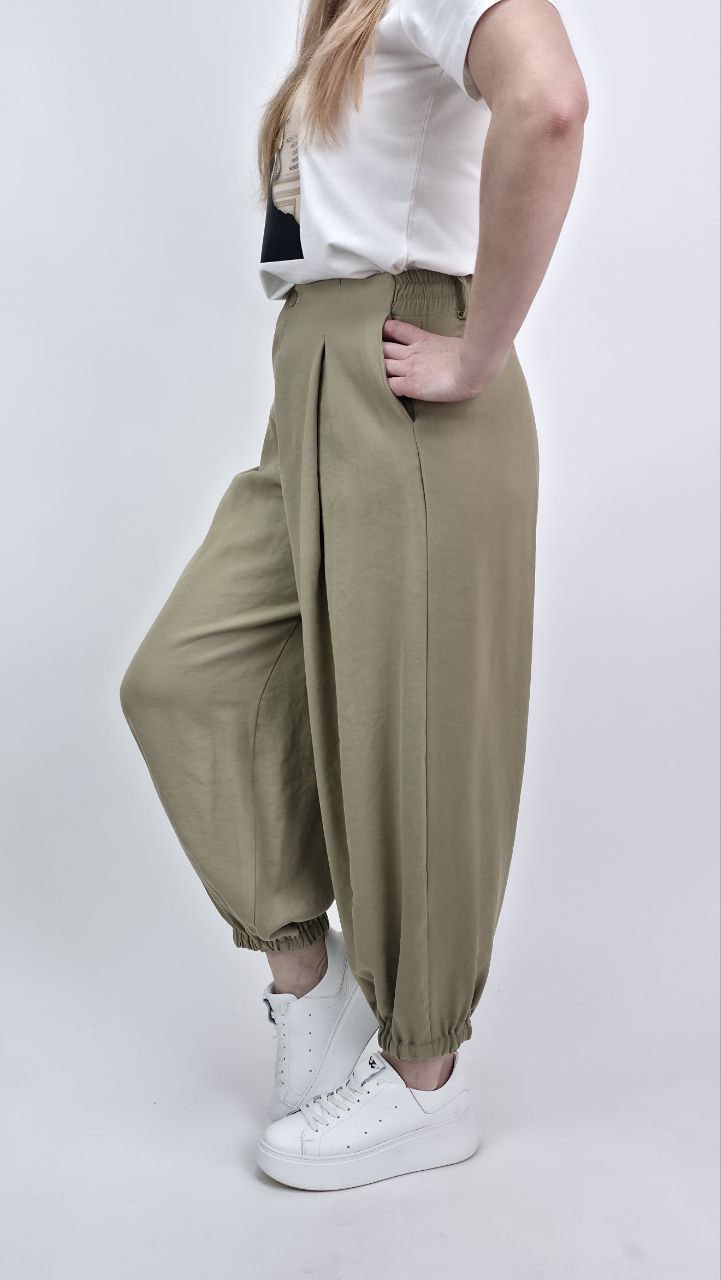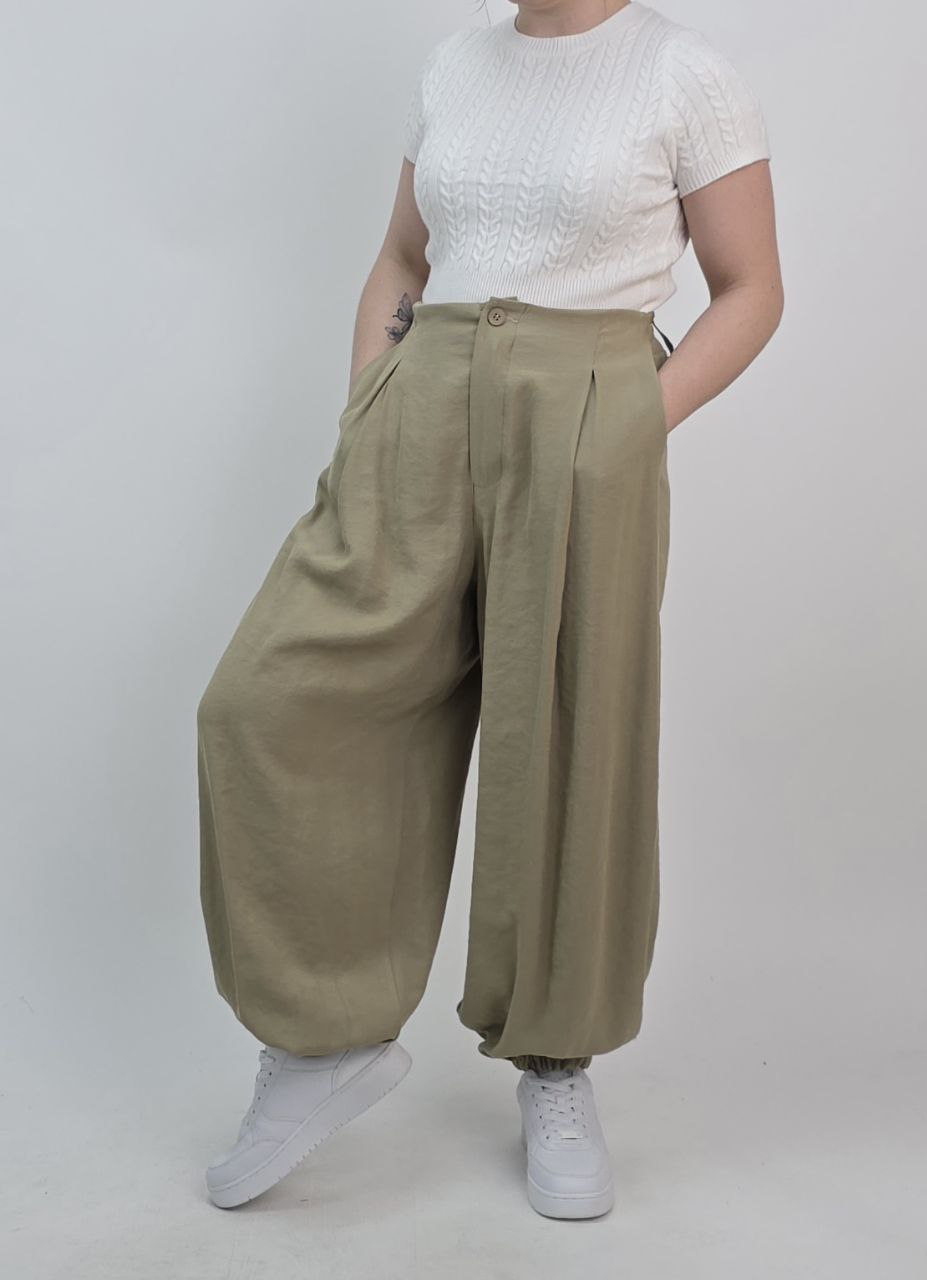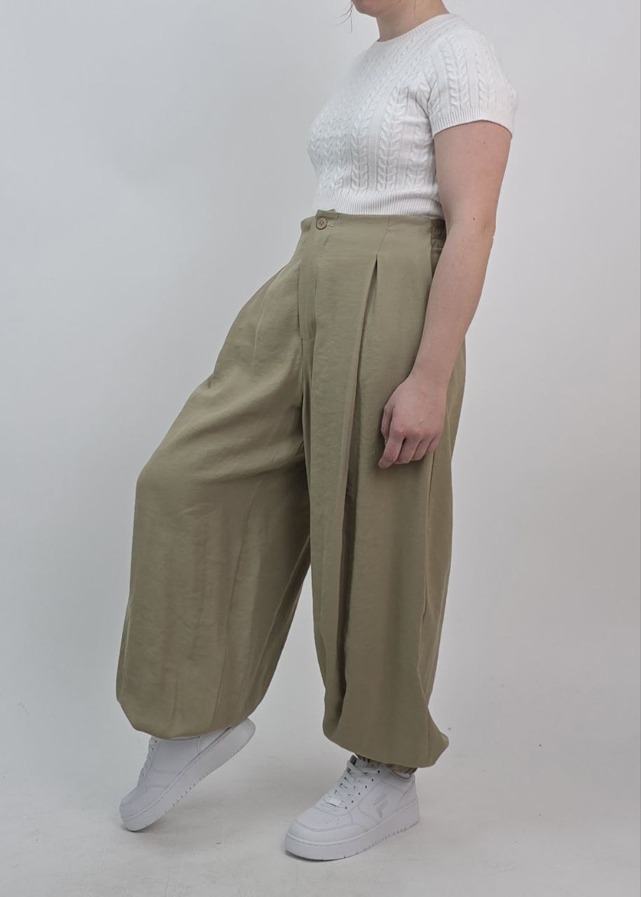 Eleganckie alladynki w modnym, oliwkowym odcieniu. Szerokie nogawki i lekka, przyjemna w dotyku tkanina wiskozowa zapewniają swobodę oraz komfort noszenia. Model zapinany na zamek, z bocznymi kieszeniami i szlufkami, idealnie sprawdzi się w stylizacjach wiosenno-letnich.