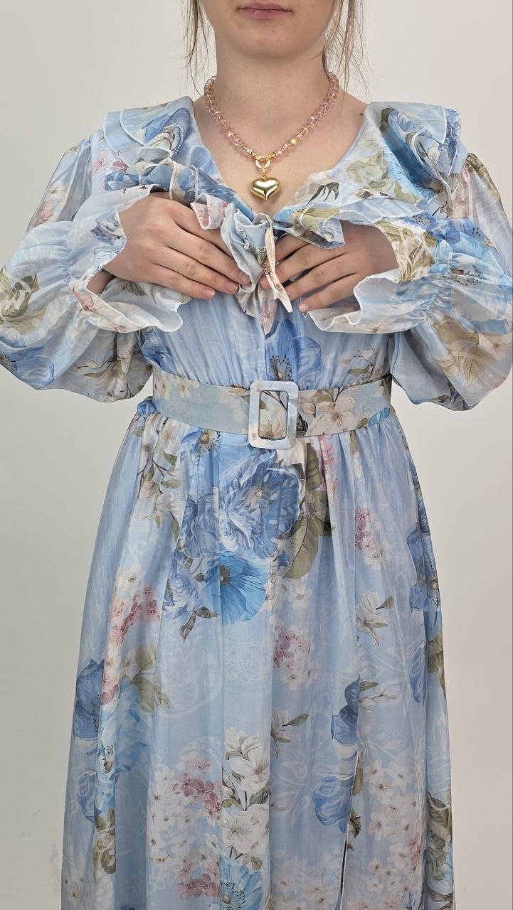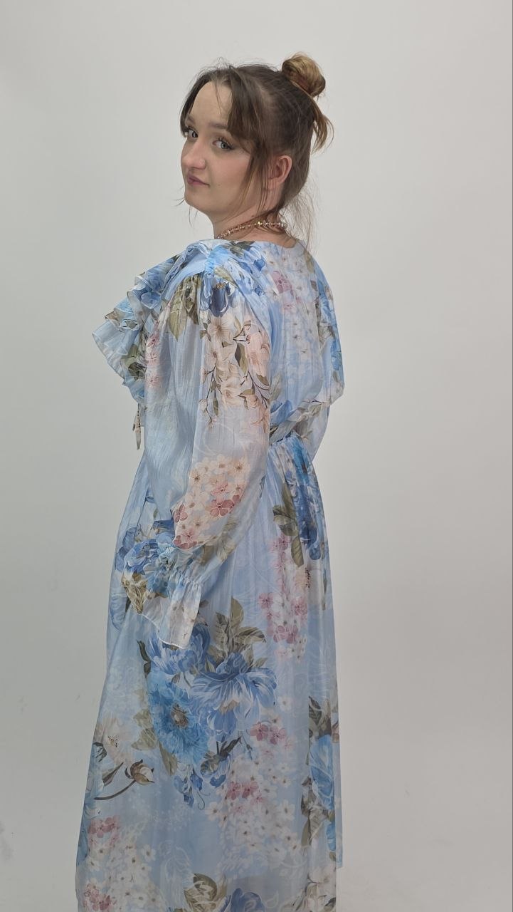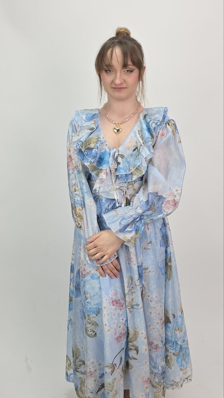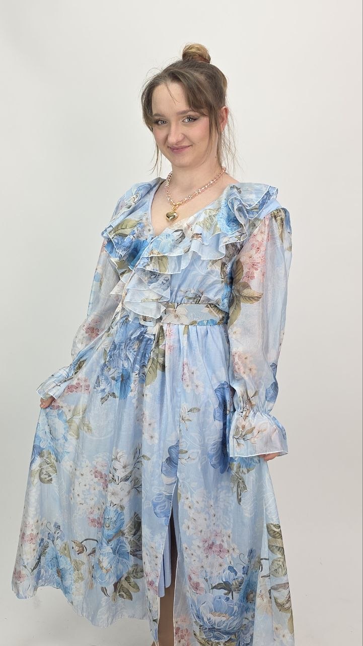 Zjawiskowa sukienka maxi w odcieniach błękitu, zachwycająca romantycznym, kwiatowym wzorem i lekką, zwiewną formą. Model stworzony z myślą o wyjątkowych okazjach — pełen kobiecego uroku i subtelnej elegancji.