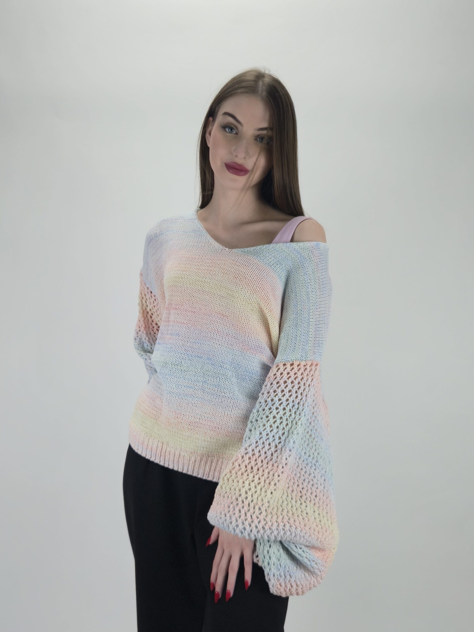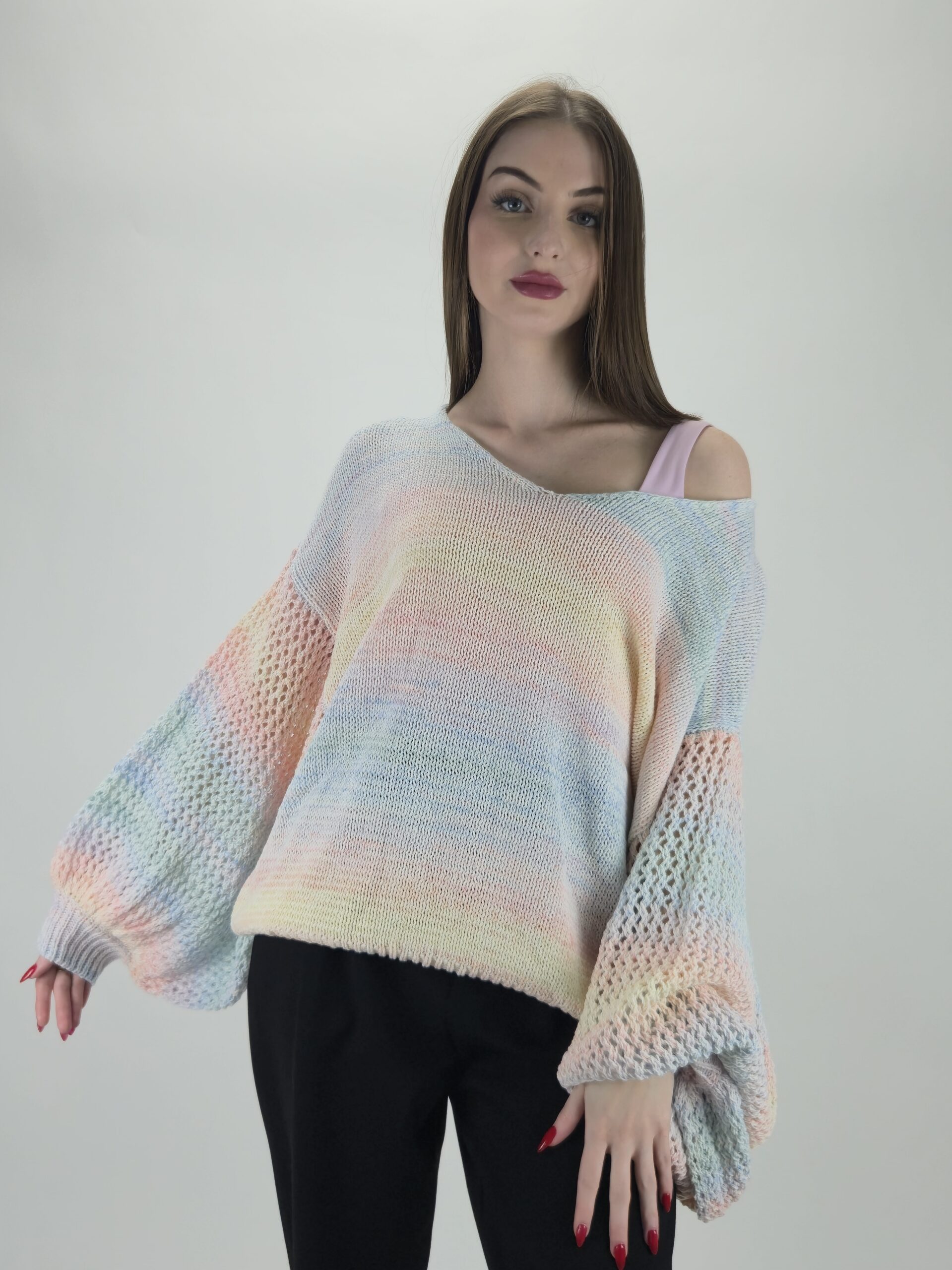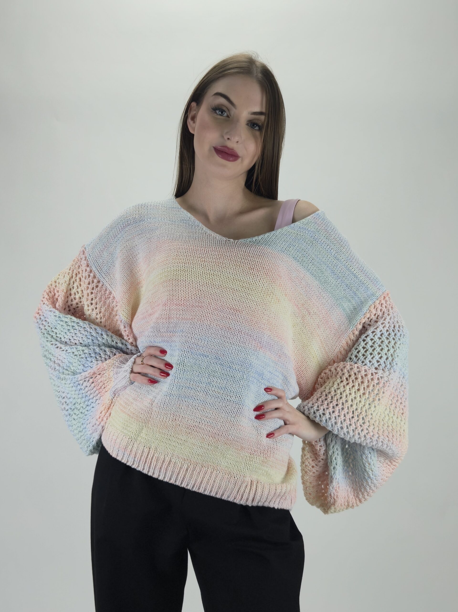 Wiosenna świeżość w Twojej garderobie Odkryj niezwykłą lekkość i styl ukryty w naszym najnowszym swetrze o fasonie oversize. Ten model to idealna propozycja dla kobiet, które pragną połączyć swobodę z subtelnym, romantycznym lookiem. Pastelowy melanż kolorów nadaje mu unikalnego charakteru, sprawiając, że każda stylizacja staje się świetlista i pełna energii.