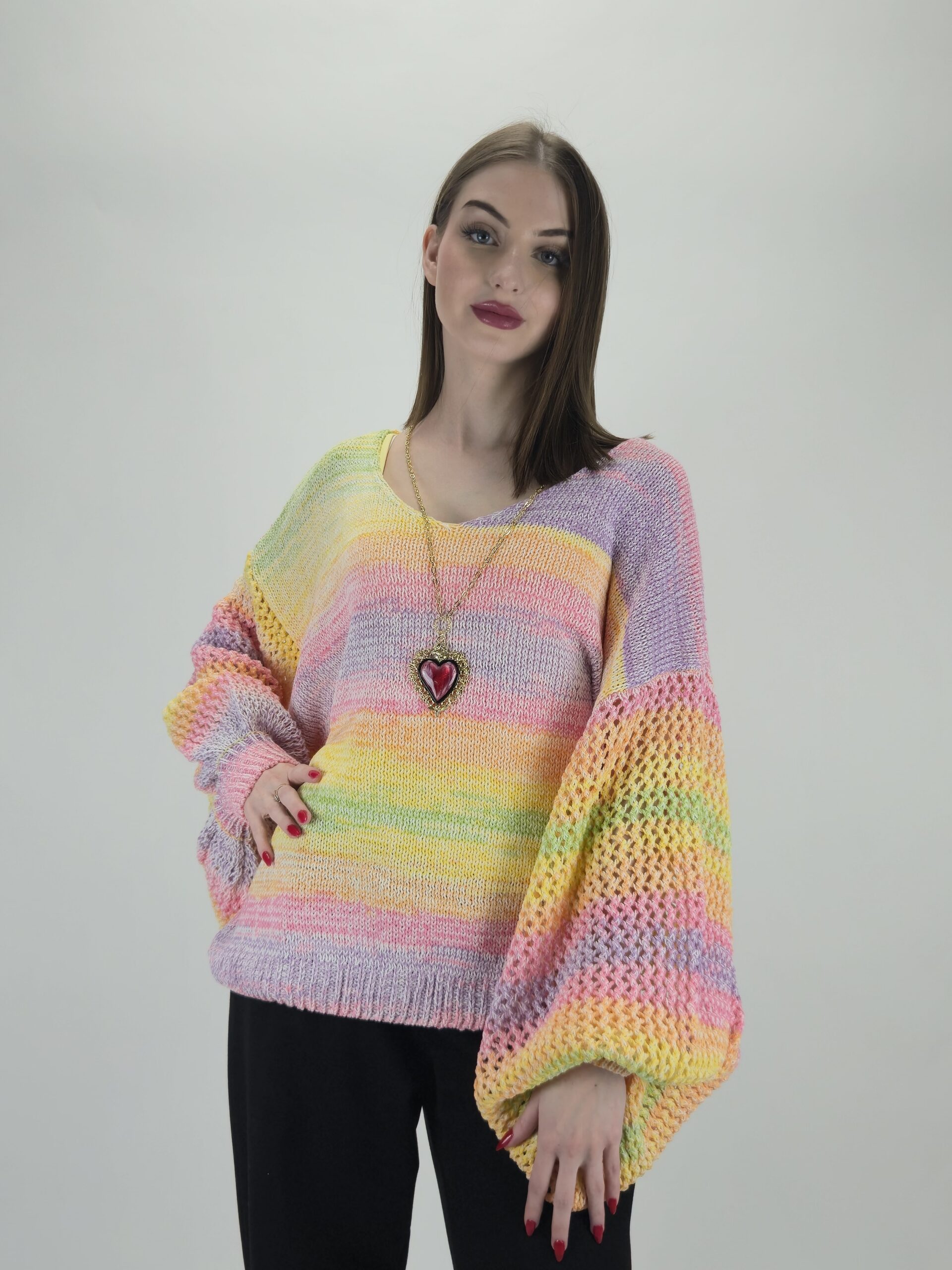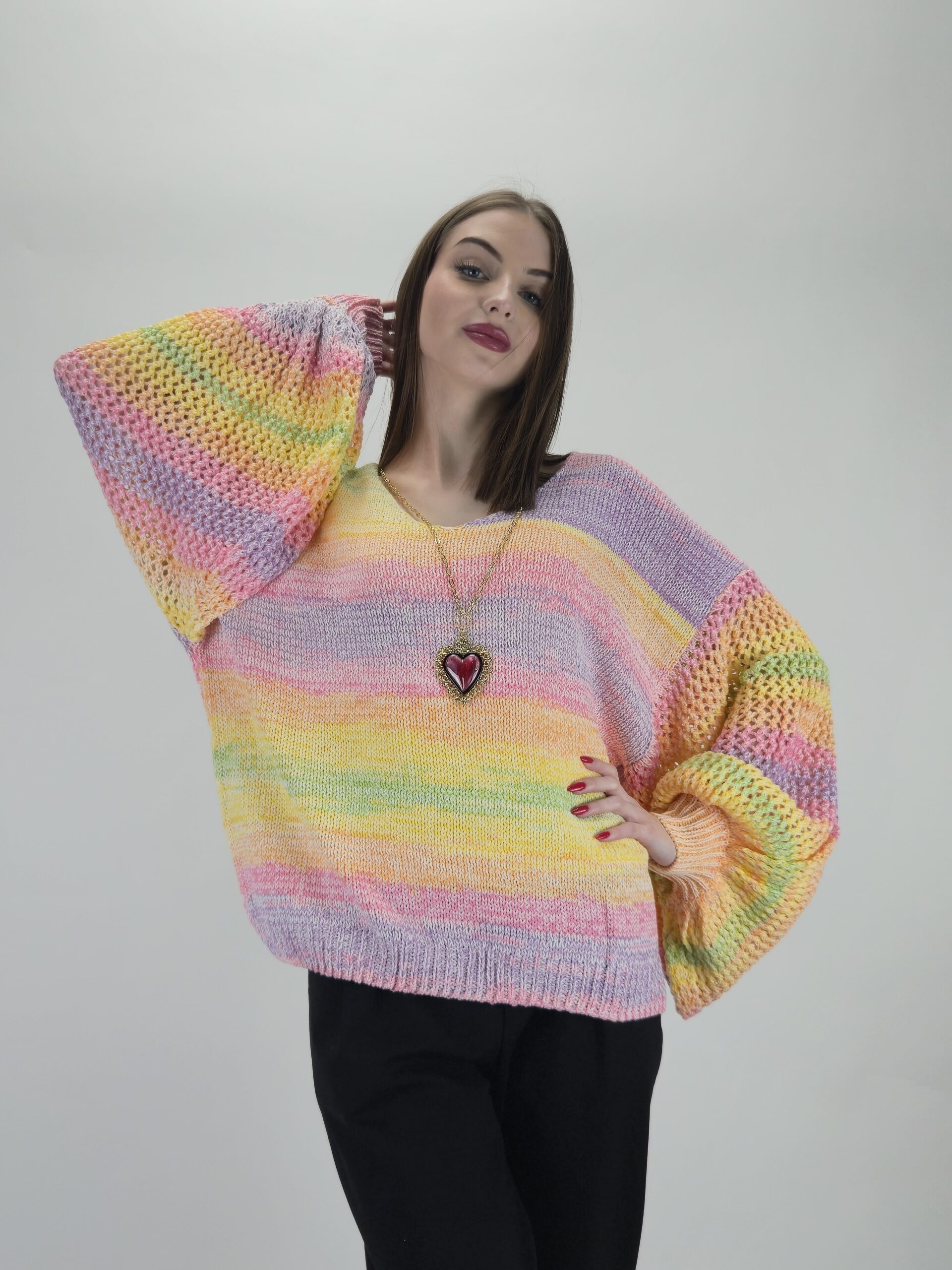Ten wrzosowy sweter to idealny wybór dla osób szukających powiewu świeżości i subtelności. Pastelowy, melanżowy splot w odcieniach fioletu, słonecznego żółtego i lila doskonale rozświetla cerę i dodaje stylizacji romantycznego charakteru.