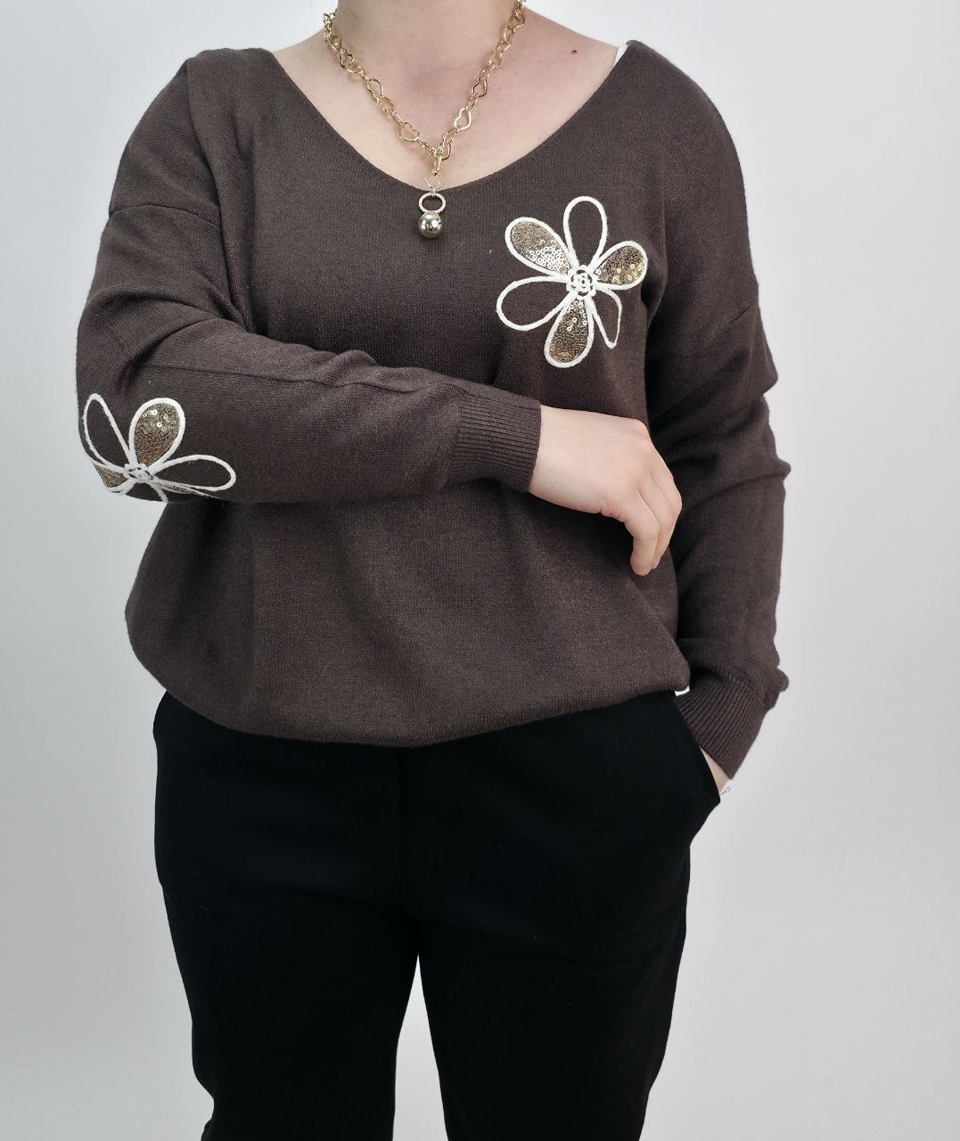 Artystyczne Zdobienia: Przód sweterka oraz prawy rękaw zdobi finezyjna aplikacja kwiatowa, która nadaje całości unikatowego, wiosennego charakteru.