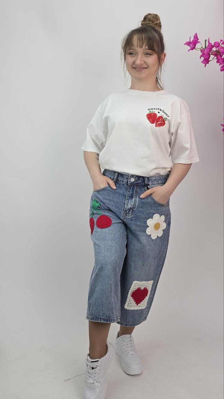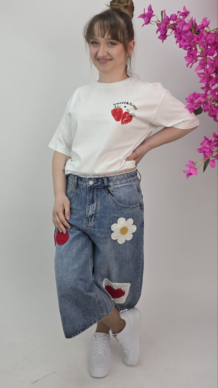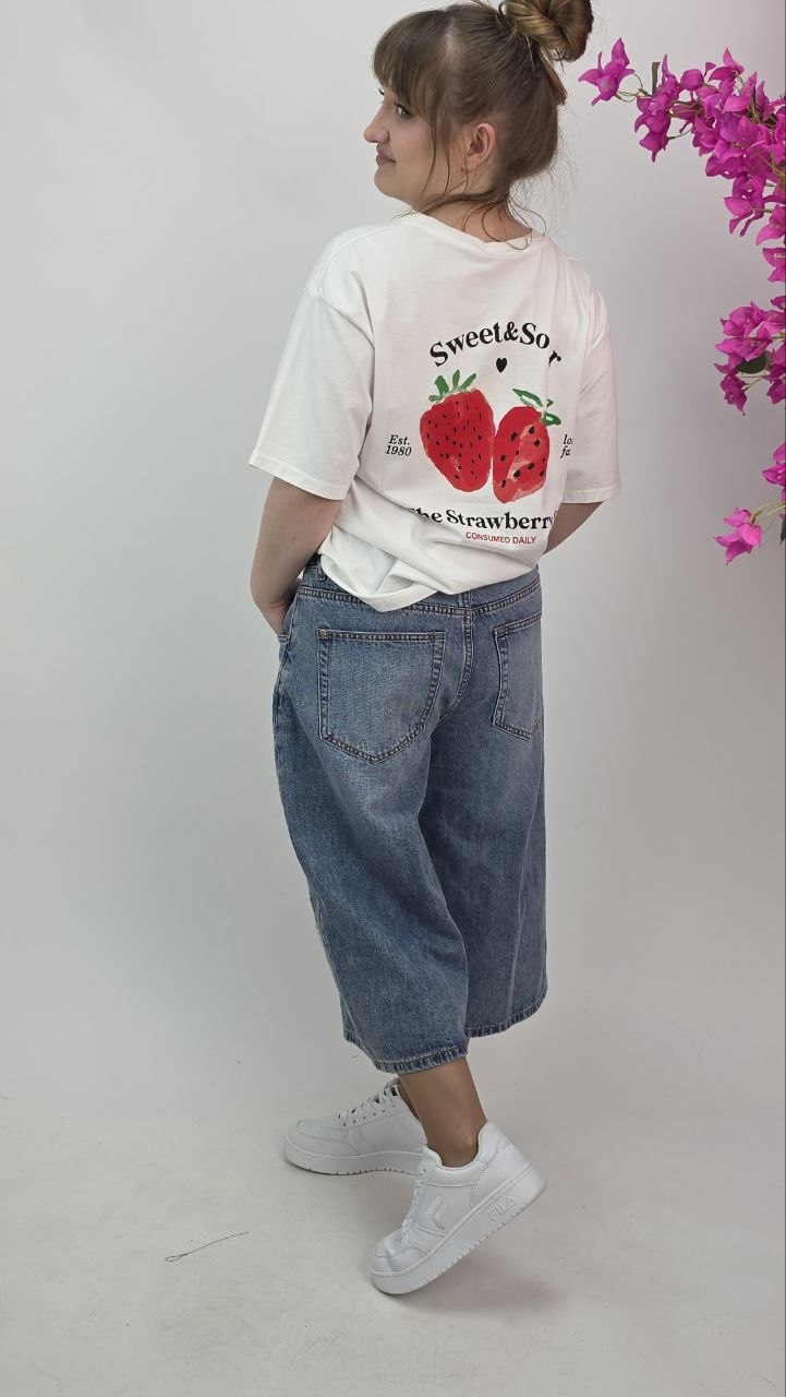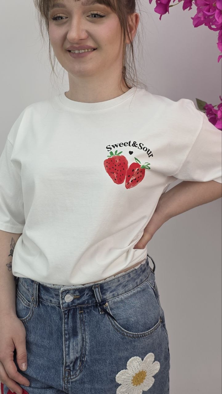 Największym atutem koszulki jest wyrazisty nadruk truskawek oraz napis, który pojawia się zarówno na przodzie, jak i na plecach. Dzięki temu t-shirt wygląda efektownie z każdej strony.