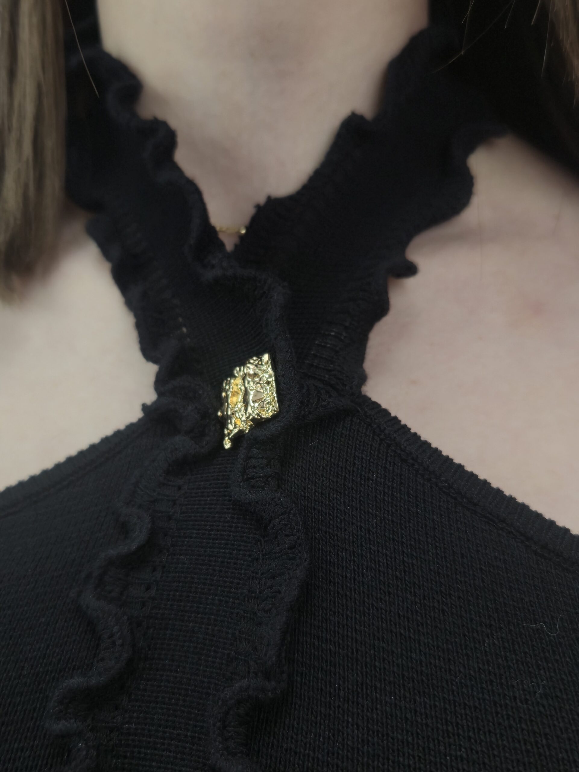 Ponadto fason halter optycznie wysmukla górną część sylwetki, dlatego top prezentuje się bardzo kobieco i nowocześnie.