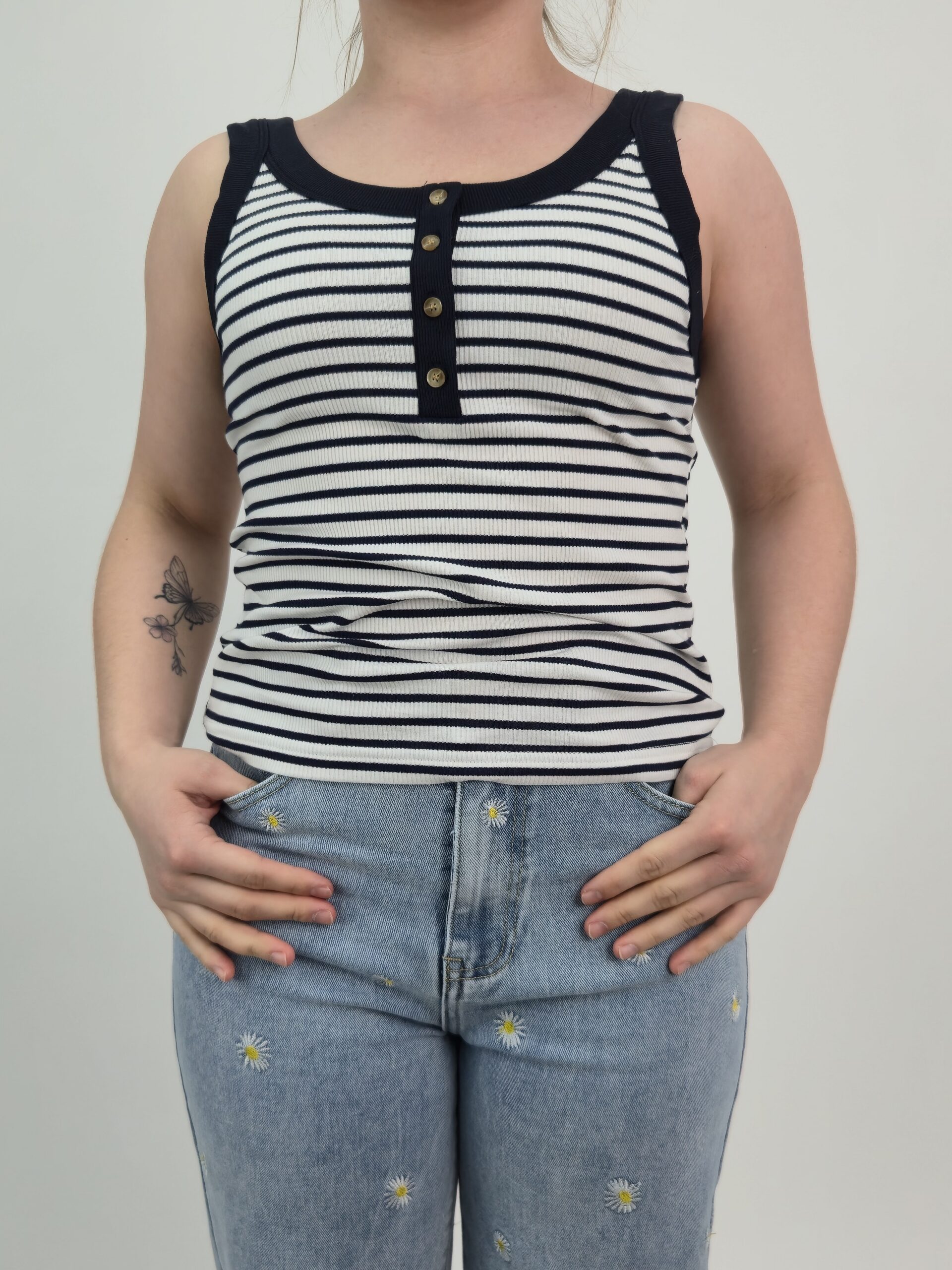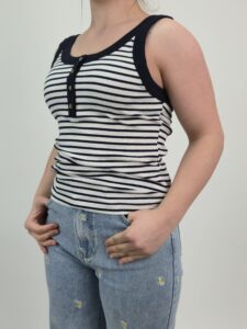 Top damski w paski w klasycznym połączeniu bieli i granatu to ponadczasowy element garderoby, który nigdy nie wychodzi z mody. Dzięki prążkowanej strukturze materiału model delikatnie podkreśla sylwetkę, a jednocześnie zapewnia pełen komfort noszenia. Co więcej, kontrastowe paski dodają stylizacji elegancji w casualowym wydaniu.