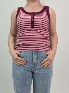 Top damski w paski w odcieniach różu i bordo to wyjątkowa propozycja dla kobiet, które cenią modne, a jednocześnie wygodne rozwiązania. Dzięki prążkowanej strukturze materiału model subtelnie dopasowuje się do sylwetki, a przy tym podkreśla jej atuty. Co więcej, poziome paski tworzą ciekawy efekt wizualny, który przyciąga uwagę i nadaje stylizacji charakteru.