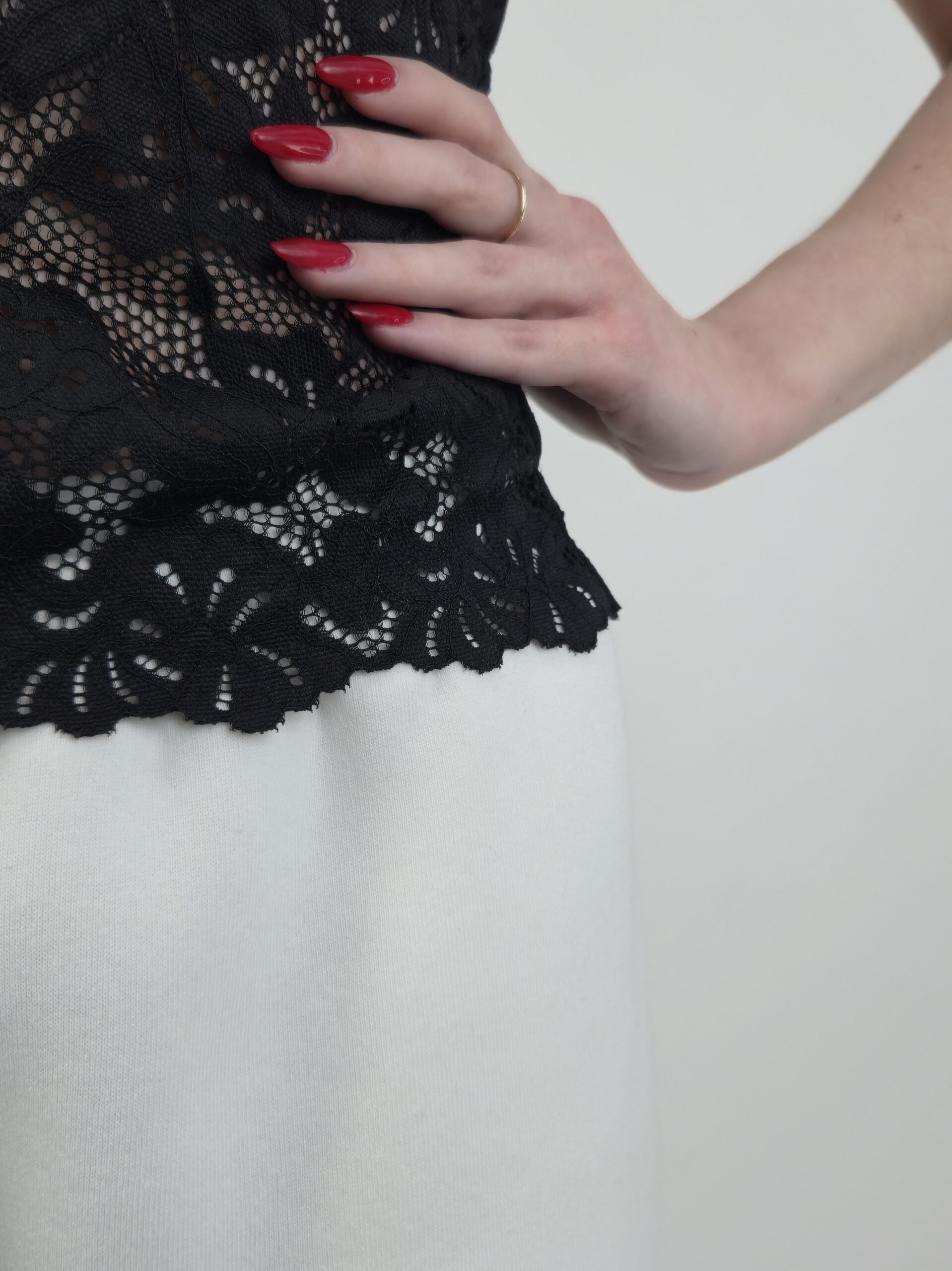 Top posiada dopasowany krój, który pięknie podkreśla sylwetkę. Dzięki koronkowemu wykończeniu całość wygląda lekko i stylowo, a jednocześnie bardzo kobieco.