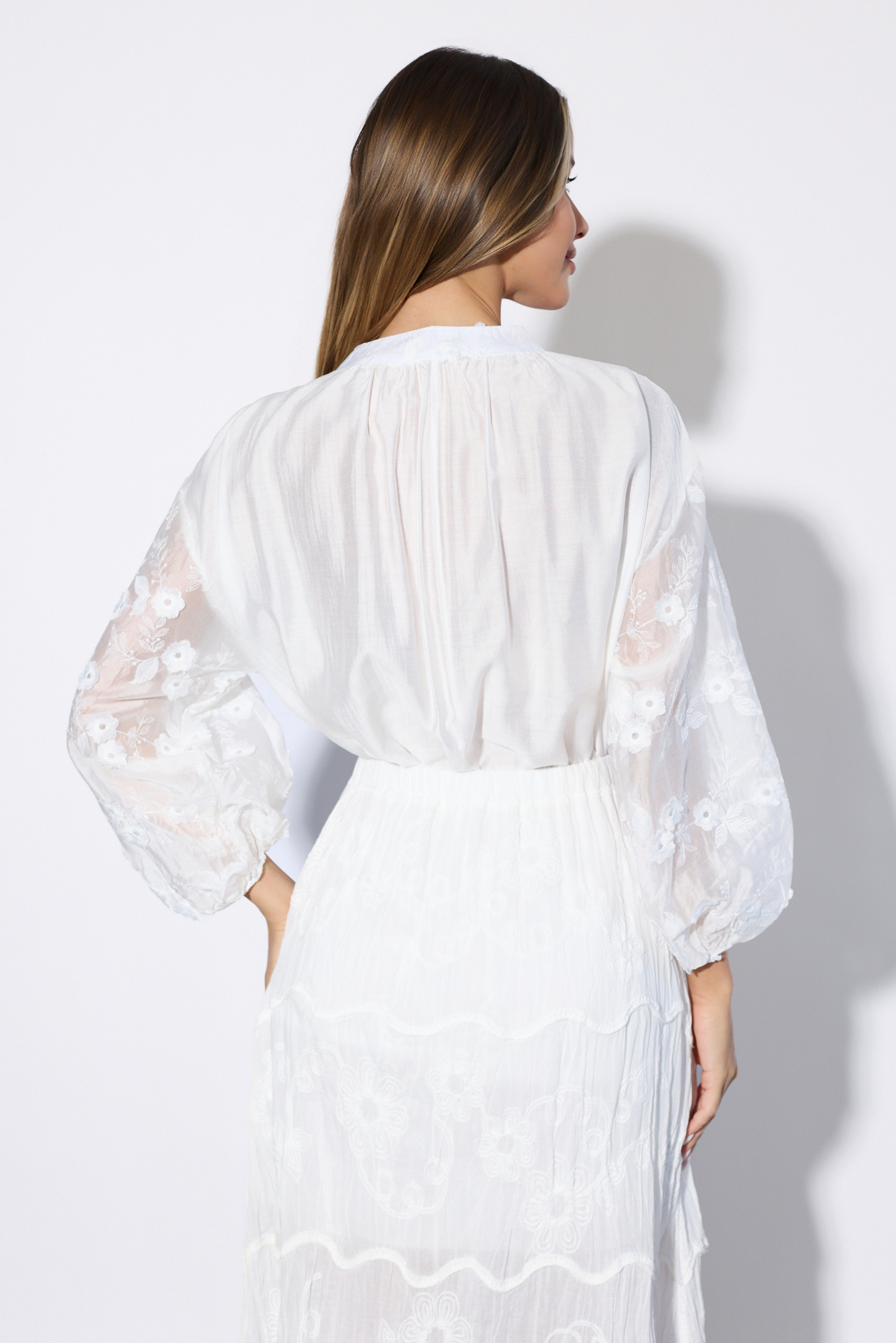Stylowa koszula w kolorze białym o luźnym kroju, która zachwyca delikatnością i dopracowanymi detalami. Model z kołnierzykiem typu stójka oraz dekoltem w serek, zapinany na subtelne guziki ukryte pod plisą, prezentuje się elegancko i nowocześnie.