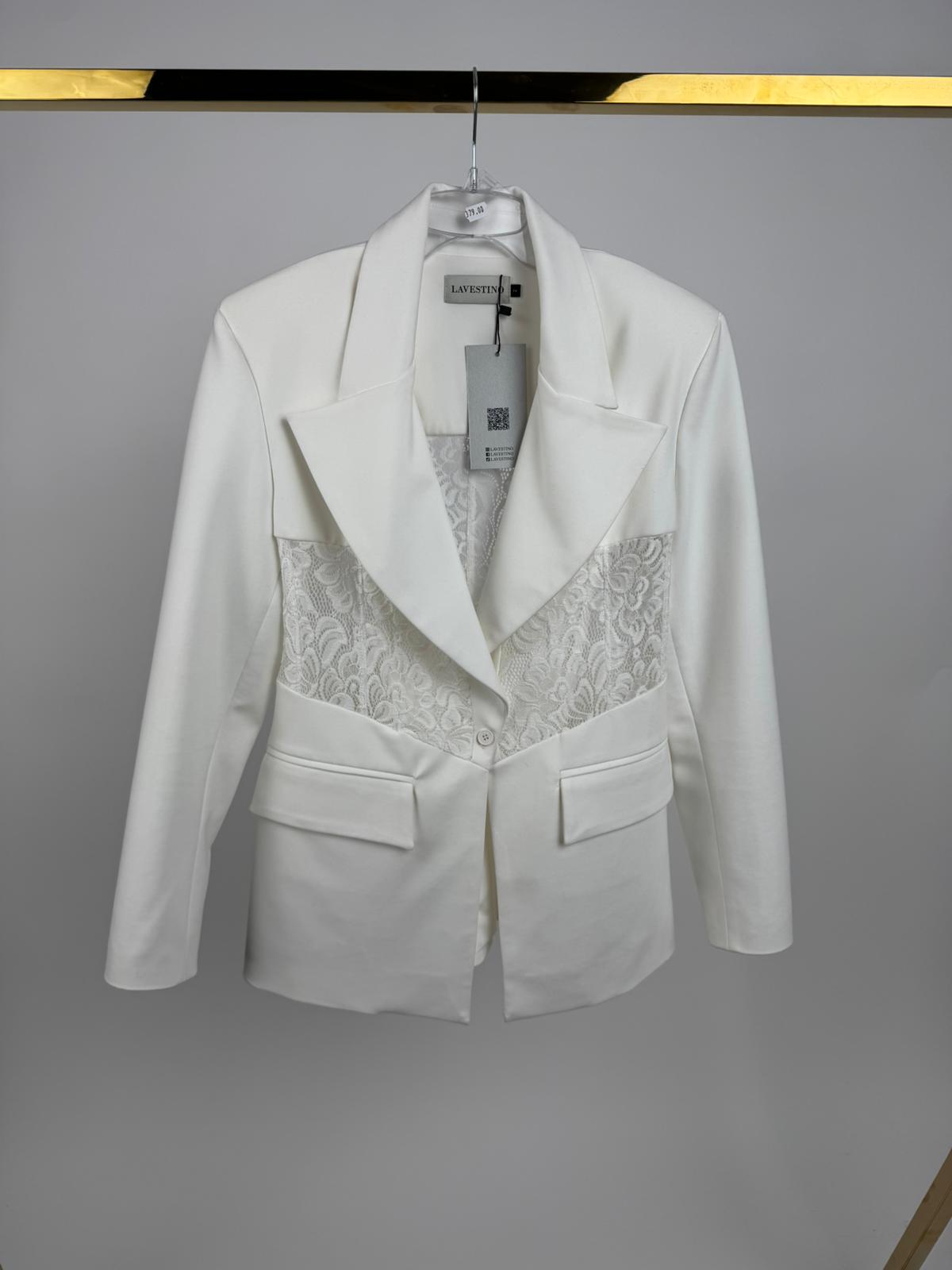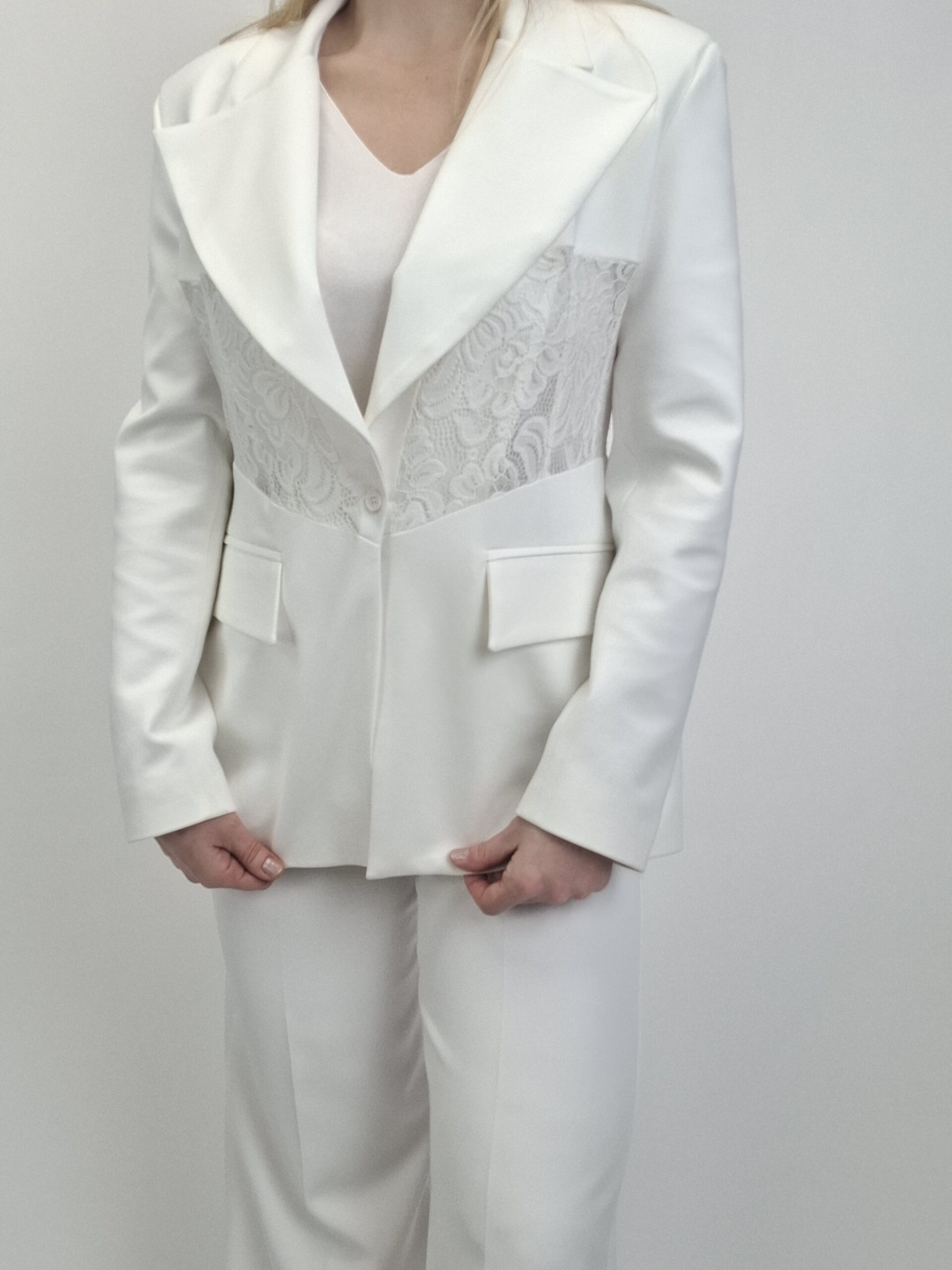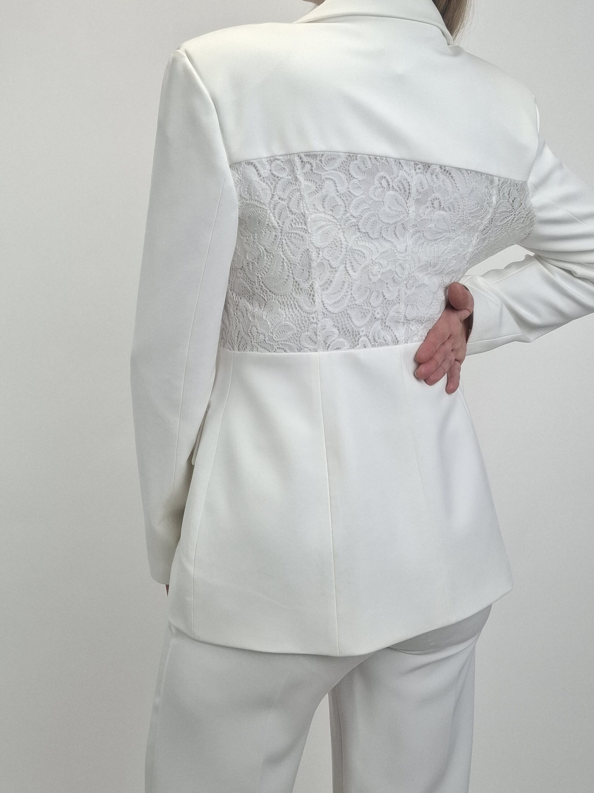 Luksusowa wstawka: Talia oraz tył żakietu zostały ozdobione misterną, białą koronką, która pięknie kontrastuje z gładkim materiałem, nadając sylwetce lekkości i wieczorowego blasku.