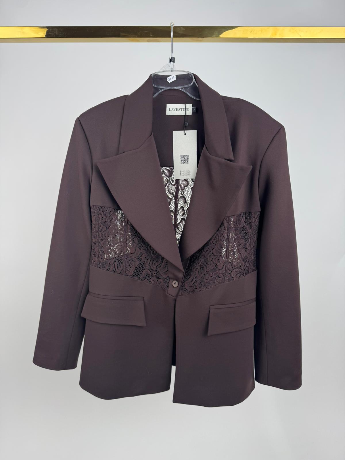 Luksusowa wstawka: Talia oraz tył żakietu zostały ozdobione misterną, czekoladową koronką, która pięknie kontrastuje z gładkim materiałem, nadając sylwetce lekkości i wieczorowego blasku.