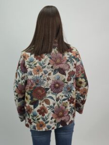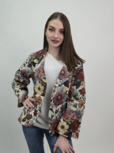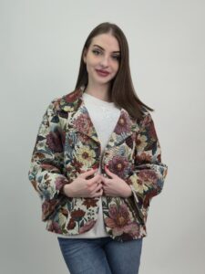 Ten żakiet żakardowy damski wyróżnia się efektownym wzorem dużych kwiatów, który przyciąga uwagę i nadaje stylizacji charakteru. Intensywniejsza, wielobarwna kompozycja sprawia, że model prezentuje się bardziej wyraziście, a jednocześnie zachowuje elegancki i ponadczasowy styl.