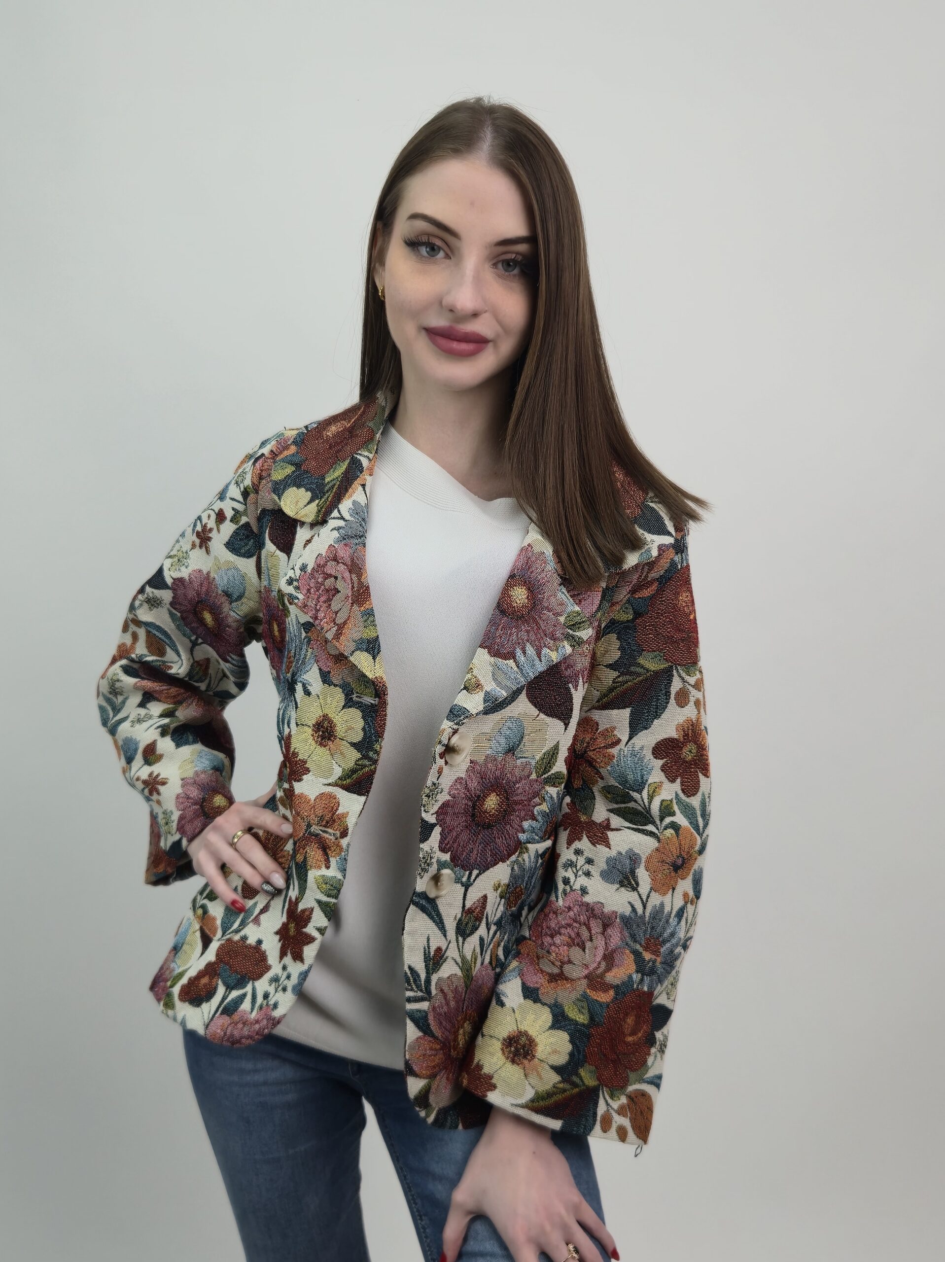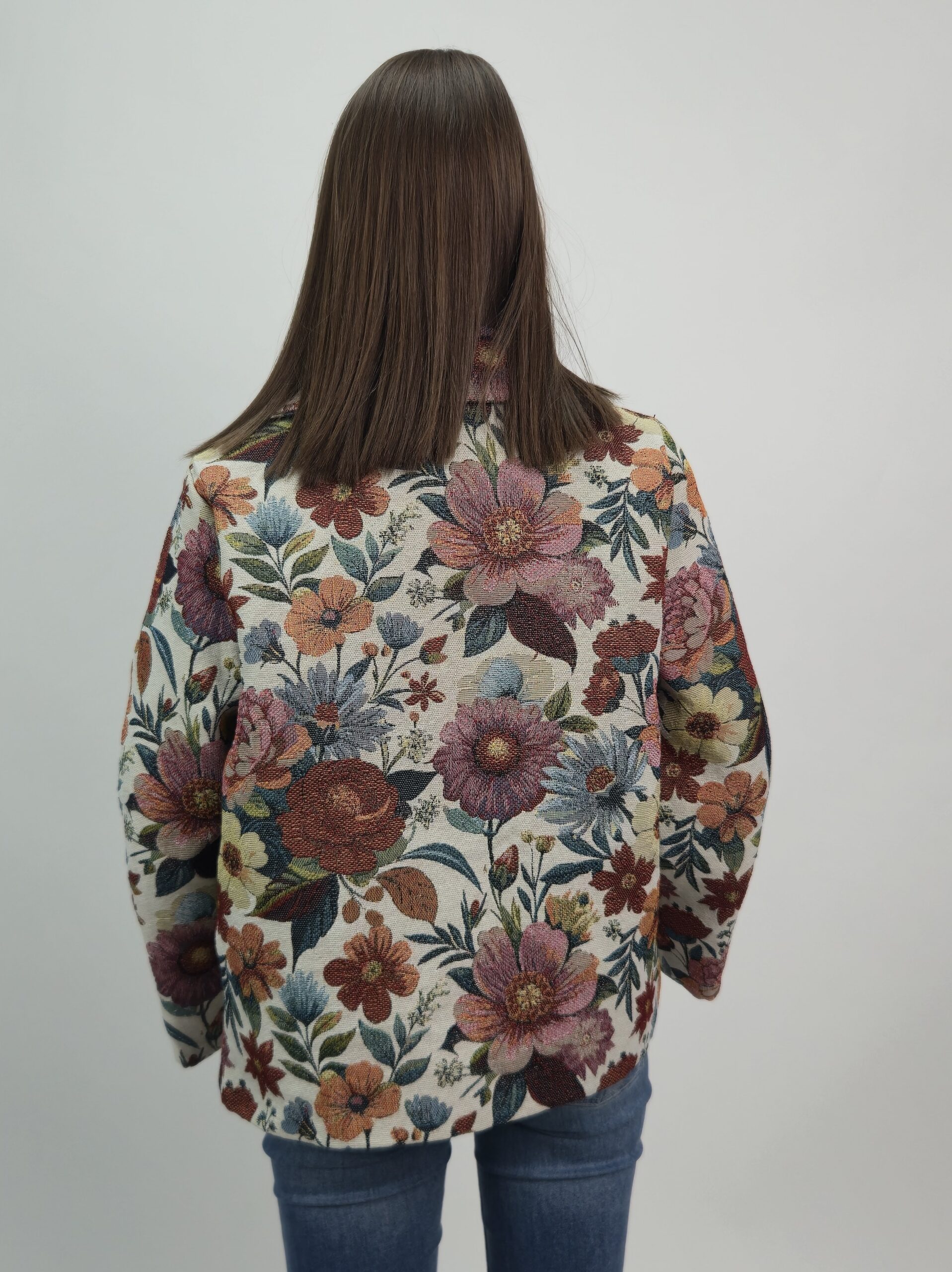 Żakiet żakardowy w duże kwiaty – wyrazisty styl i elegancja
