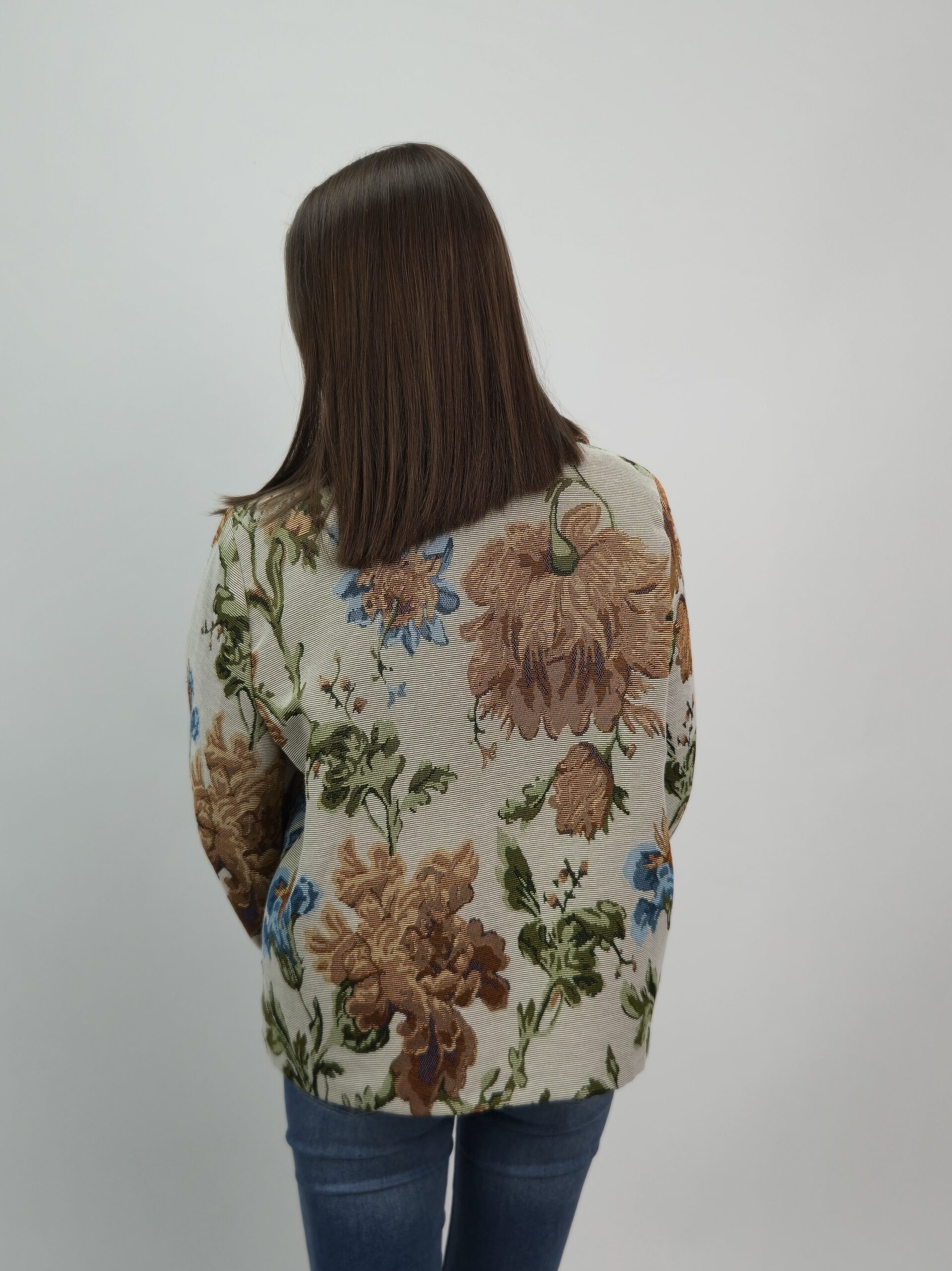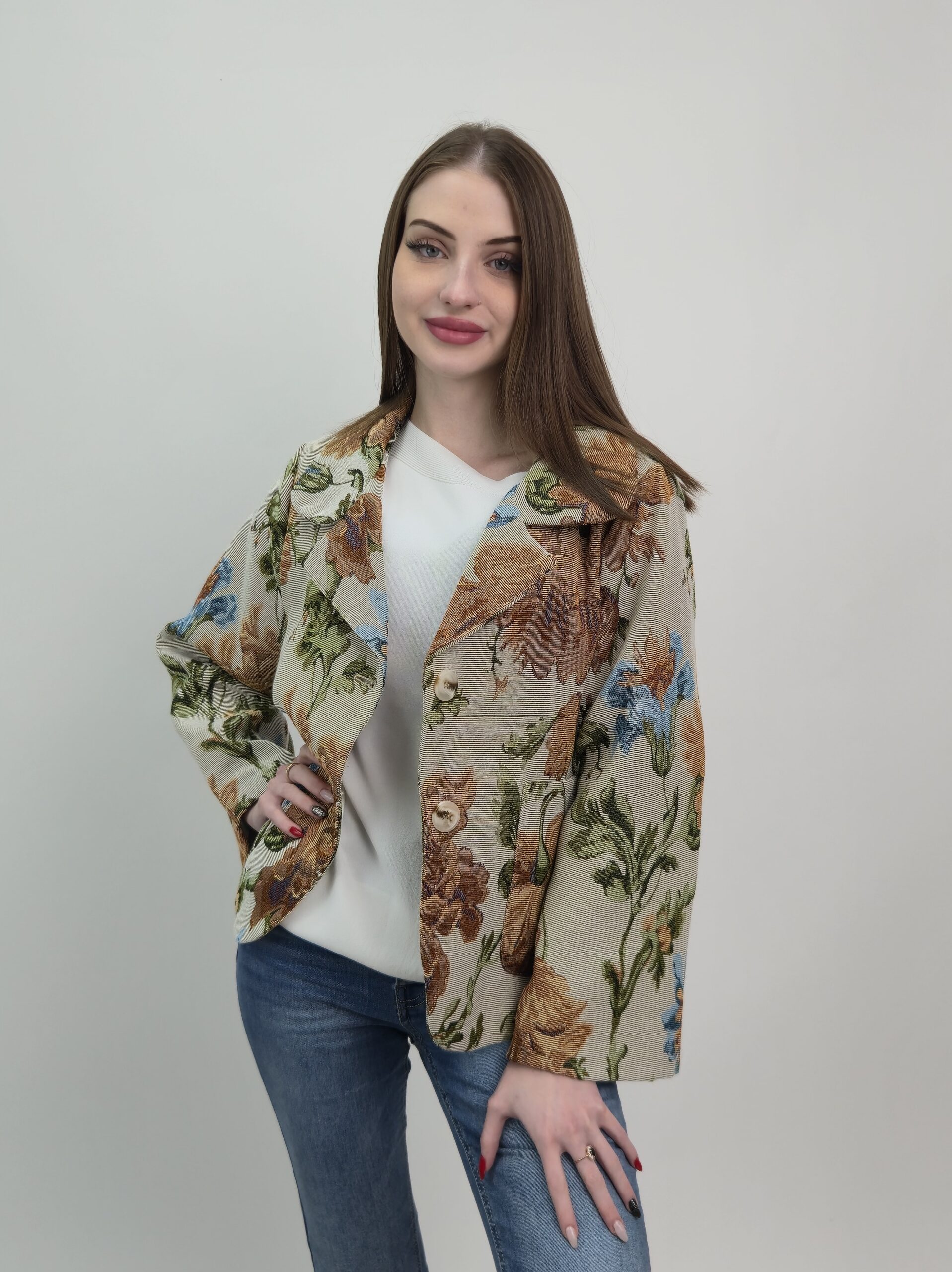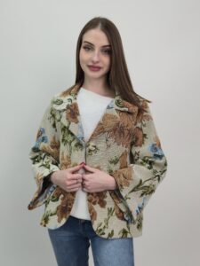 Ten żakiet żakardowy damski zachwyca wyjątkowym wzorem oraz elegancką formą, dlatego doskonale sprawdzi się w wielu stylizacjach. Motyw florystyczny w ciepłych, naturalnych odcieniach nadaje całości wyrafinowanego charakteru, a jednocześnie podkreśla kobiecy styl.
