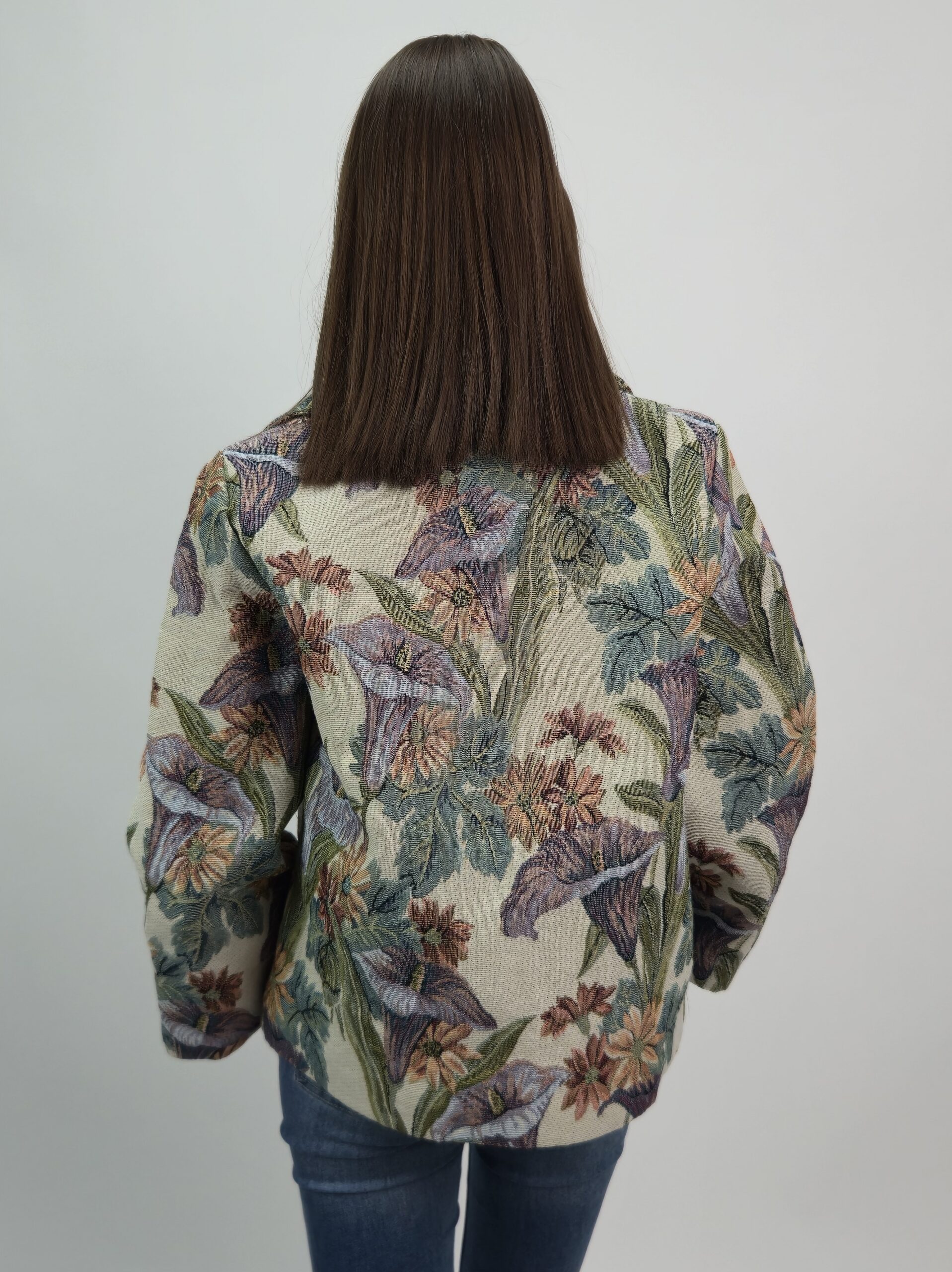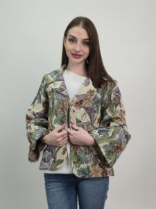 Ten żakiet żakardowy damski to wyjątkowe połączenie klasycznej elegancji i modowego charakteru. Bogaty, florystyczny wzór nadaje mu wyrazistości, dlatego model doskonale uzupełnia zarówno codzienne, jak i bardziej eleganckie stylizacje.