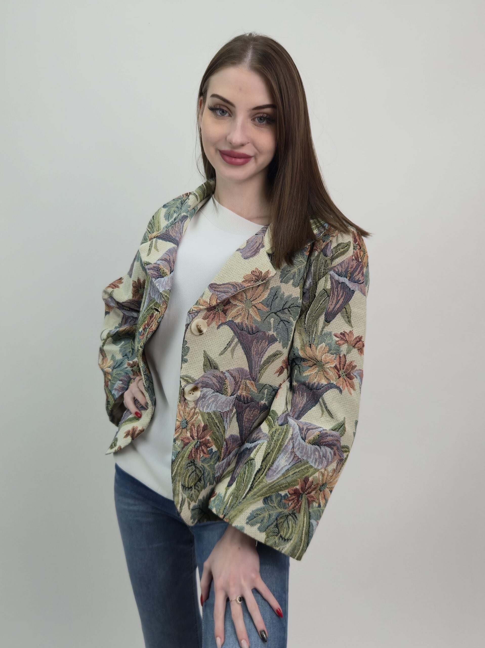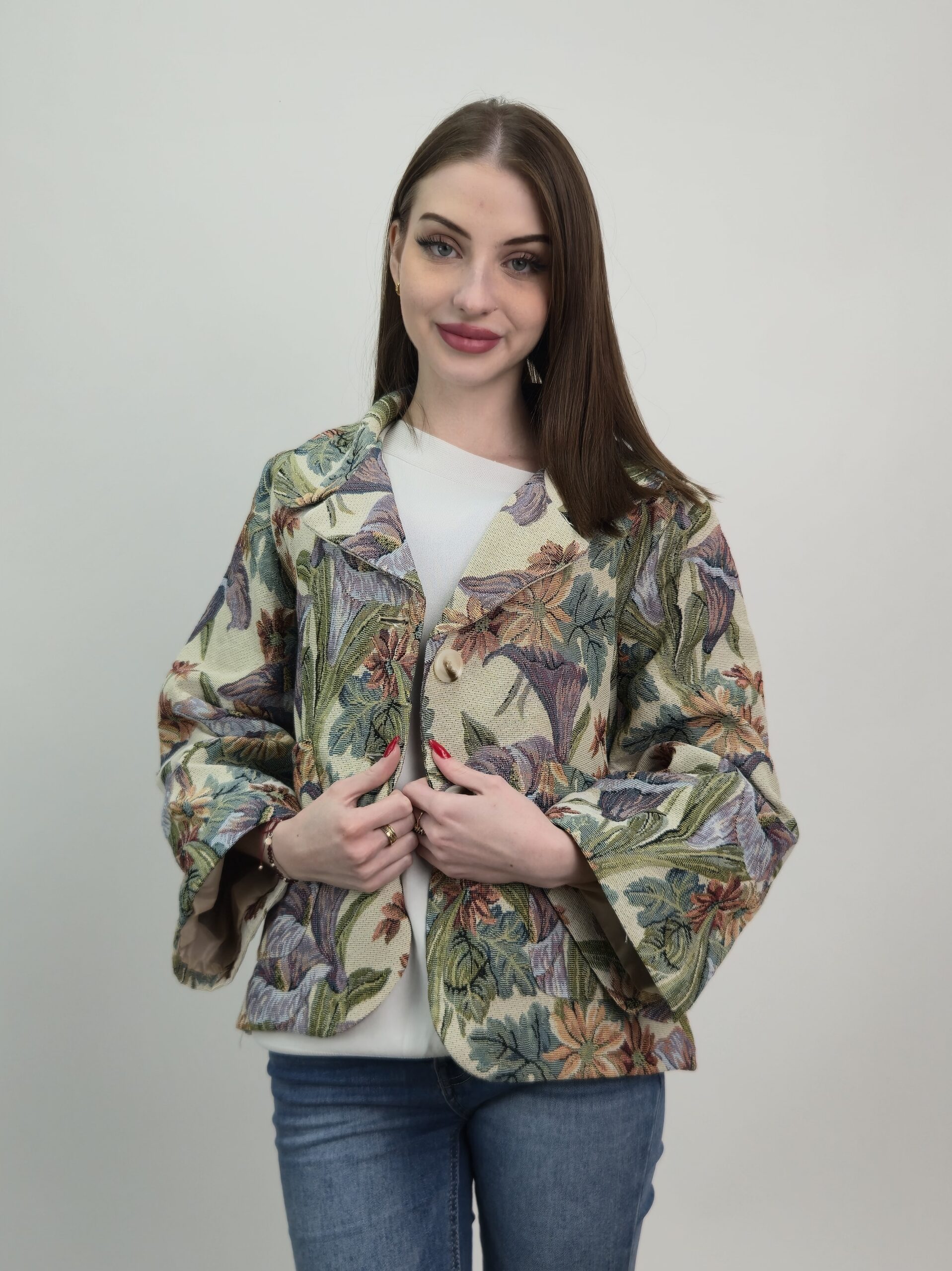 Dodatkowo wielokolorowy motyw kwiatowy przyciąga uwagę i sprawia, że żakiet staje się centralnym elementem stylizacji.